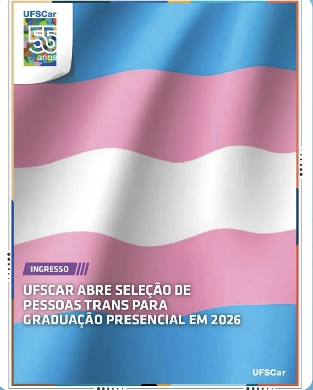 A UFSCar, por meio da Pró-Reitoria de Graduação (ProGrad), divulgou o Edital nº 24/2025, que regulamenta a seleção específica para ingresso de pessoas trans nos cursos presenciais de graduação em 2026. As inscrições devem ser realizadas entre os dias 25 de outubro e 14 de novembro de 2025, exclusivamente pelo formulário eletrônico disponível em sistemas.ufscar.br/sagui/login.