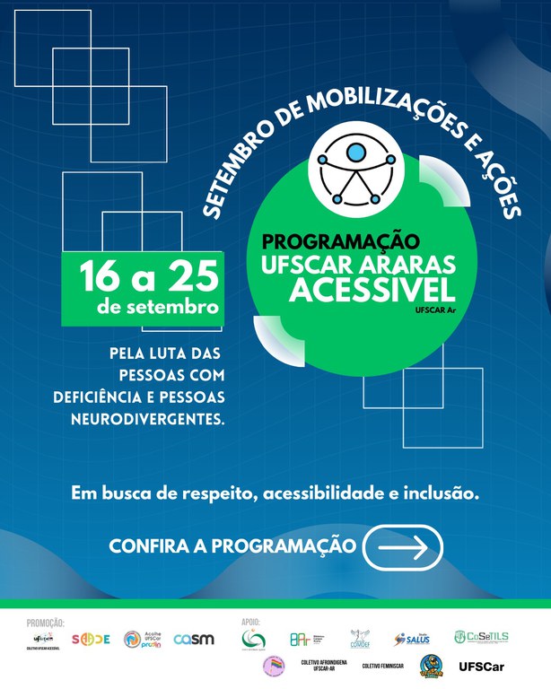 A realização é do Coletivo UFSCar Acessível de Araras, da Secretaria de Ações Afirmativas, Diversidade e Equidade (SAADE) do Campus Araras, do Projeto de Desenvolvimento Institucional (ProDIn) Acolhe UFSCar Araras e da CASM, com o apoio de diversas unidades e instituições parceiras